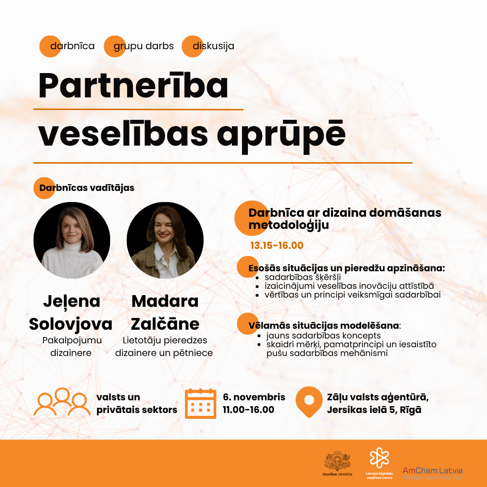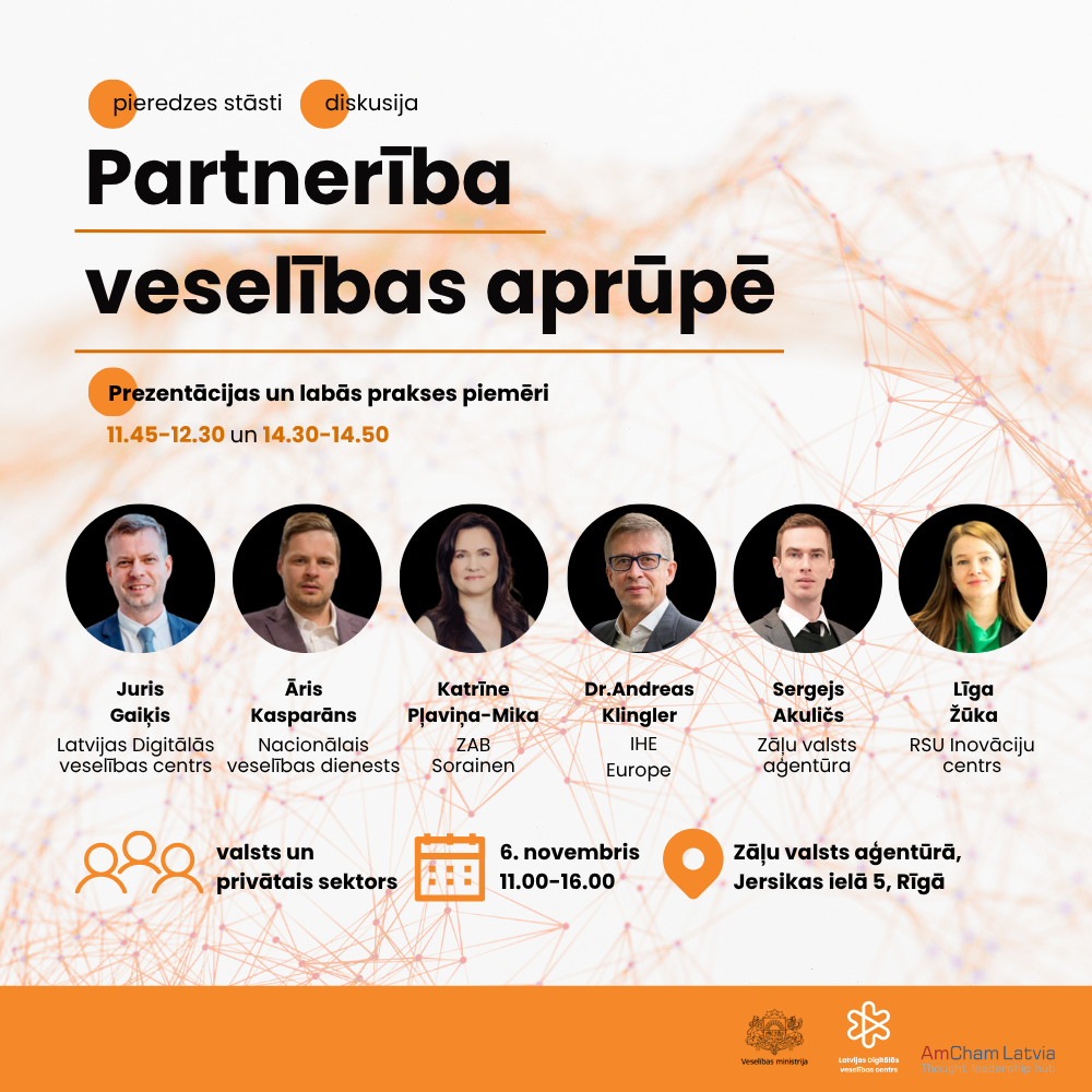 Veselības ministrija sadarbībā ar Latvijas Digitālās veselības centru (LDVC) un Amerikas Tirdzniecības palātu Latvijā (AmCham) 6. novembrī darbnīcā “Partnerība veselības aprūpē” kopā pulcēs valsts un privātā sektora spēlētājus, lai rastu risinājumus efektīvai sadarbībai, kā arī veicinātu inovāciju un jaunu tehnoloģiju ieviešanu veselības aprūpē.